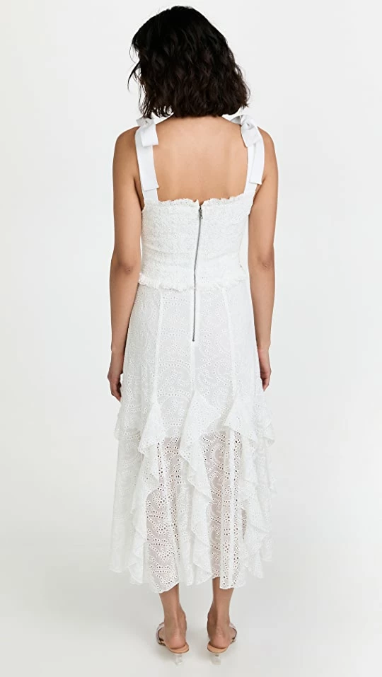 Featuring ruffles, bows, and intricate eyelet patterning, this pretty-as-a-picture alice + olivia white dress will be a new favorite. Wear yours with a tonal pair of strappy sandals.