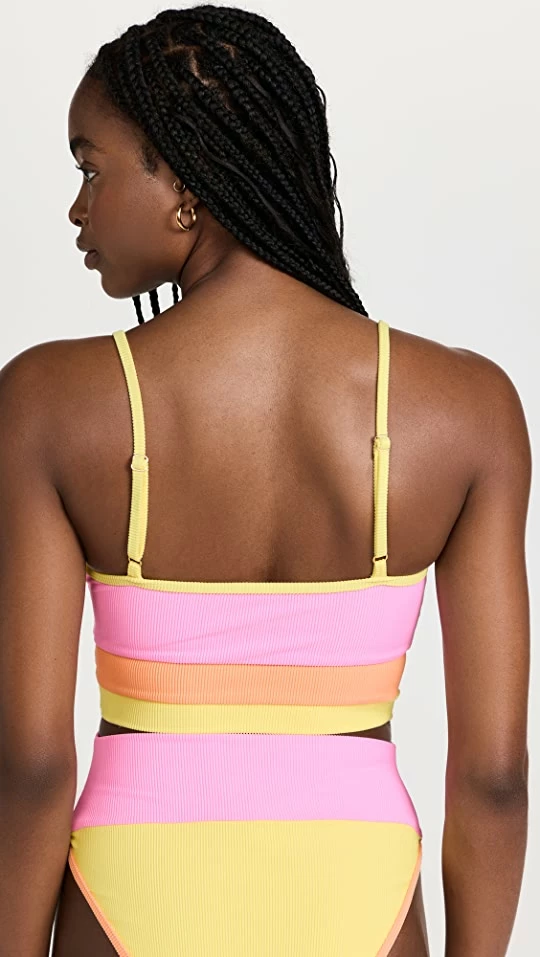 A sporty Beach Riot bikini top in a longline silhouette, featuring pastel colorblocking for a cheerful look.