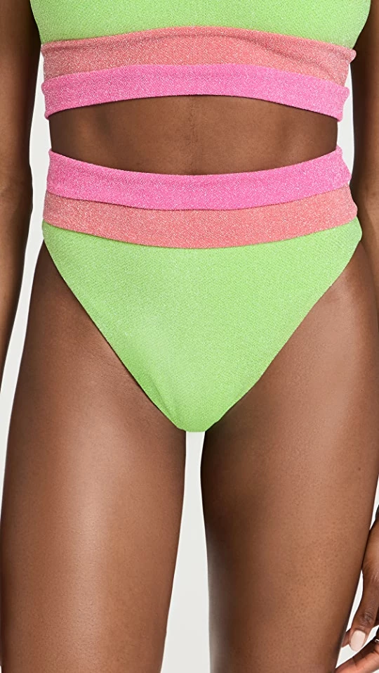 Beach Riot delivers a reliably bold pair of bikini bottoms that spotlight a neon colorblock motif and hints of metallic thread for extra shimmer.