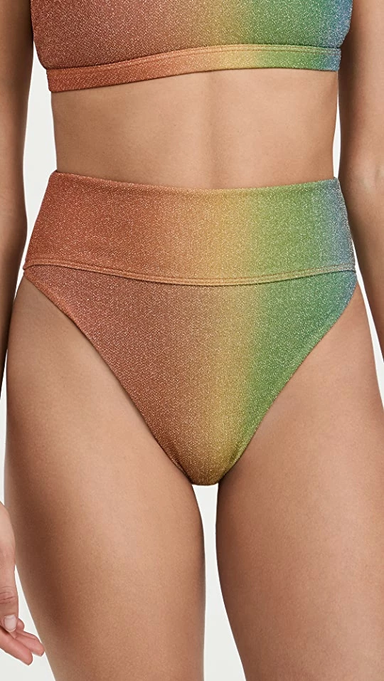 With a metallic sheen and rainbow ombrΓ© color, these high-waisted Beach Riot bikini bottoms won’t go unnoticed.