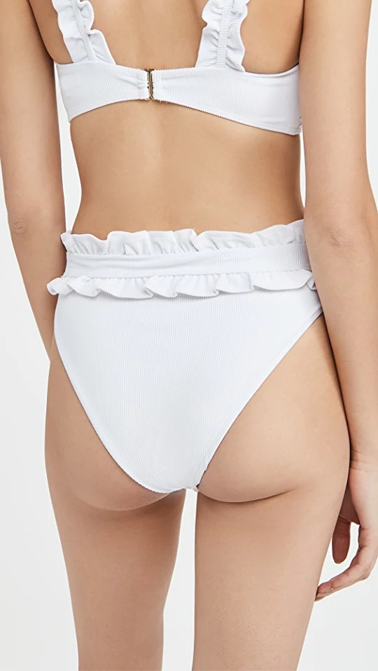 Dainty ruffles at the high waist bring a charming look to these ribbed Beach Riot bikini bottoms.