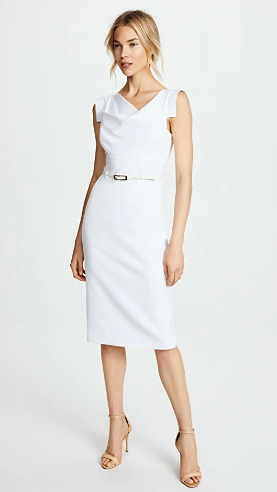 A polished and versatile favorite, Black Halo’s signature Jackie O Dress features a timelessly elegant sheath dress silhouette accented with a cowl neckline and skinny belt.