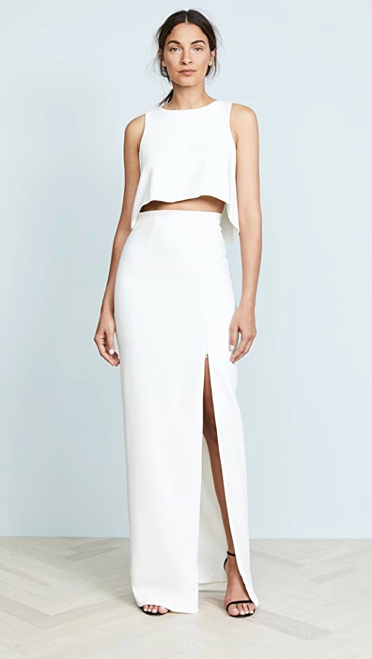 This Black Halo dress is crafted in a two-piece design that can be worn together or as separates. The boxy bodice is cropped with a subtly uneven hem that dips lower in back, and the tailored skirt cuts a clean line with a high-waisted profile.