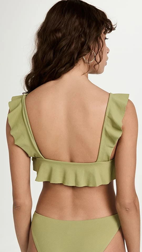 A lightly colored and textured Eberjey bikini top, dressed up with ruffles at the bodice and shoulder straps.
