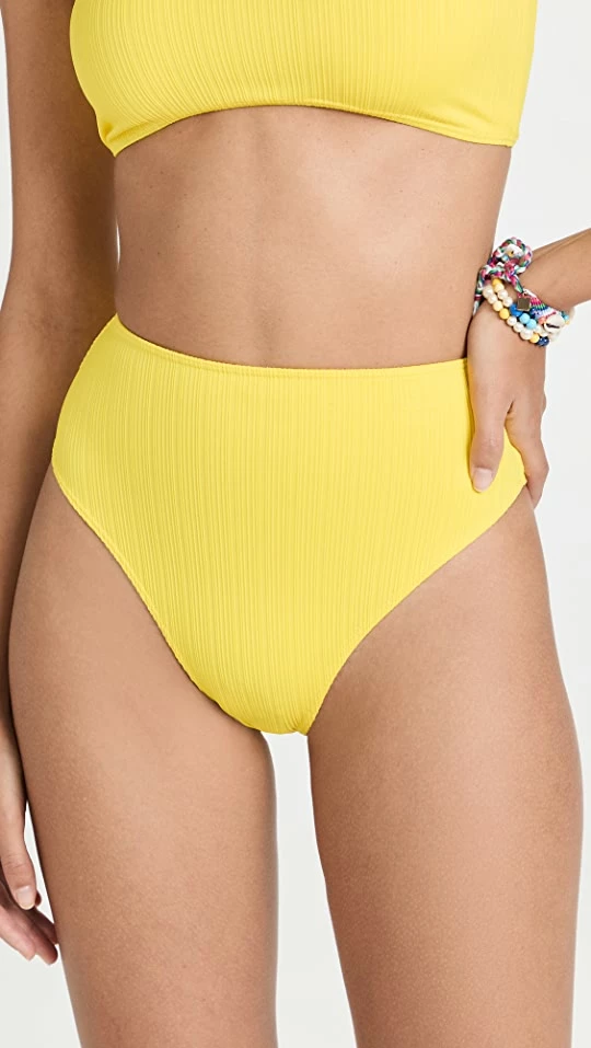 Bright-yellow color draws the eye to these ribbed, high-rise Frankies Bikinis bikini bottoms.