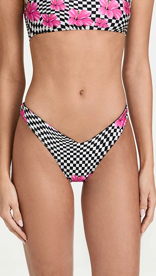 A cheeky pair of Frankies Bikinis bikini bottoms with a unique look, which comes courtesy of a mix of floral and check patterns.