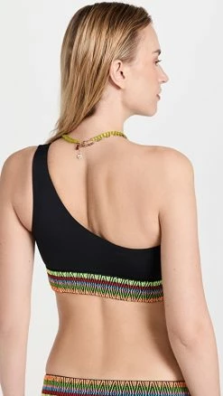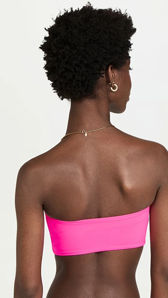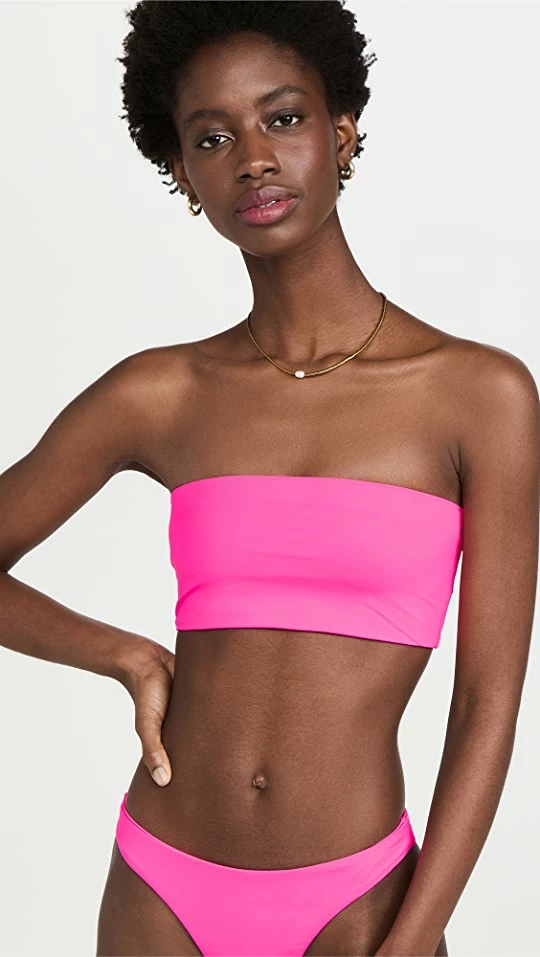 Always a good choice if you’re searching for a strapless look, this Good American bandeau bikini top takes things in a fun direction with bold neon color.