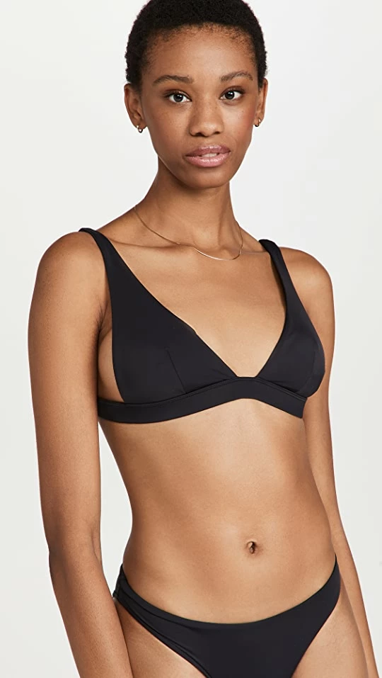 Keep your sunny-day look toned down in this simple yet effective Good American bikini top, which features a classic triangle silhouette and a jet-black hue.