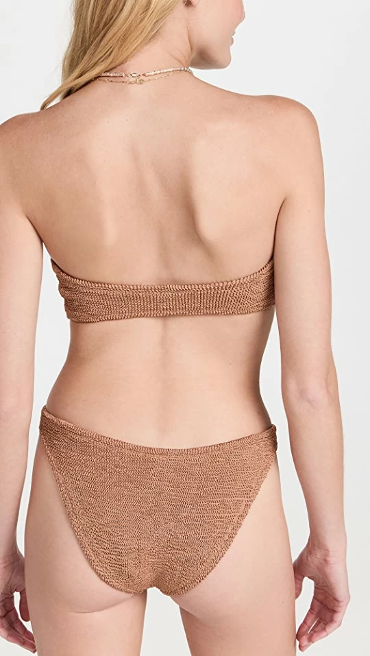 A sophisticated version of a simple bandeau bikini. This ring-trimmed Hunza G bikini set is crafted from the brand’s signature crinkle fabric, which is specifically designed to conform to your every curve.