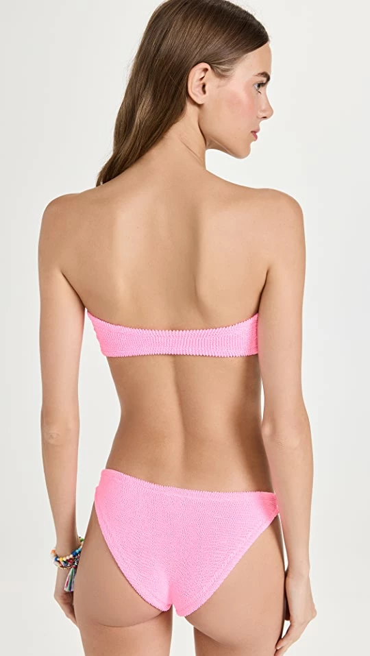 A pretty and colorful version of a simple bandeau bikini. This bow-trimmed Hunza G bikini set is crafted from the brand’s signature crinkle fabric, which is specifically designed to conform to your every curve.