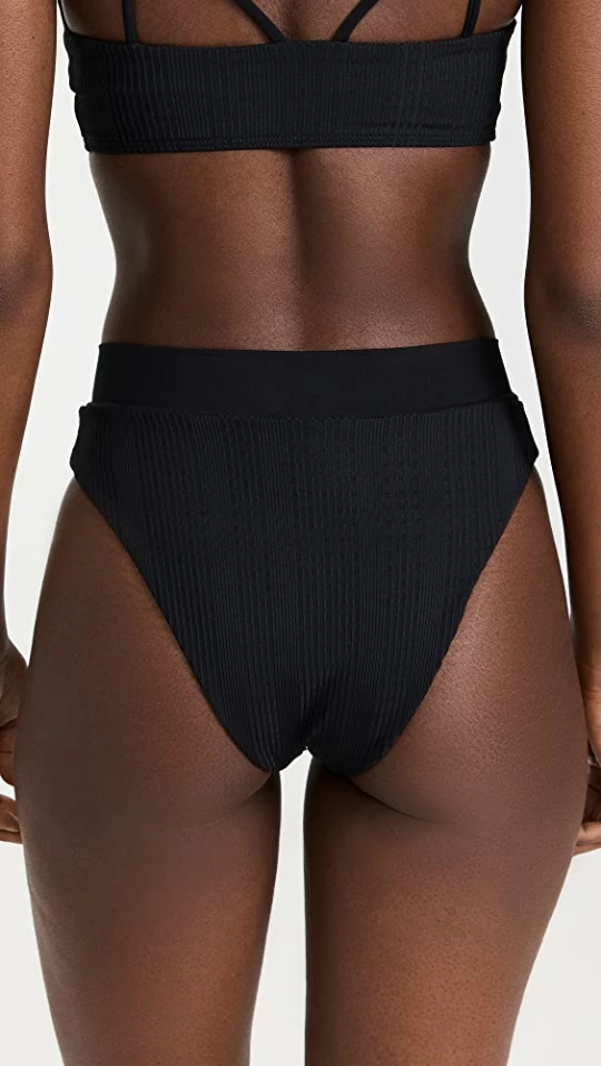 An understated pair of L*Space bikini bottoms in black ribbed fabric, distinguished by a crossover-V waistband.