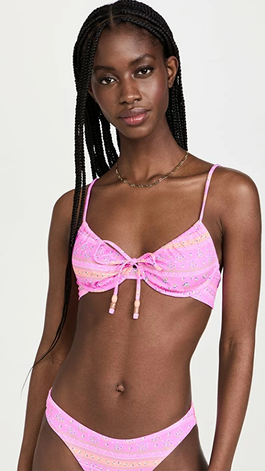 This Maaji underwire bikini top features a reversible design that gives you the choice between floral prints, and is punctuated by a thin bow at the center.