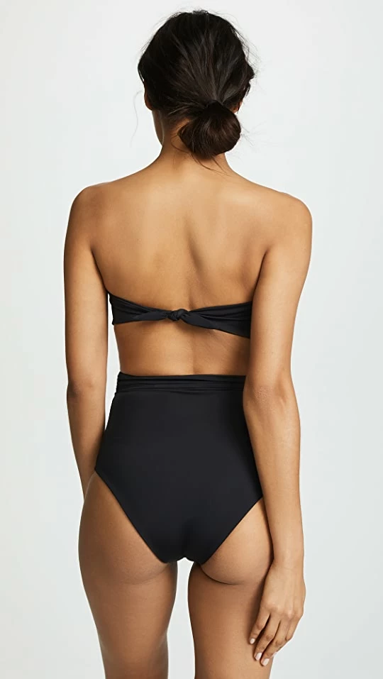 This toned-down and slightly sporty Mara Hoffman bandeau bikini top gains just a touch of texture from ruching at the boned sides. Match this piece with the label’s coordinating high-rise bottoms, and throw on an understated cover-up if you’re in the mood to layer.