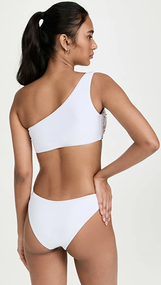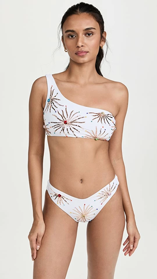 Elevate your seaside ensembles with this OCEANUS bikini, which brings a glamorous look to a classic single-shoulder silhouette with one of the label’s signature intricate designs of sparkling sequins and colorful beads.
