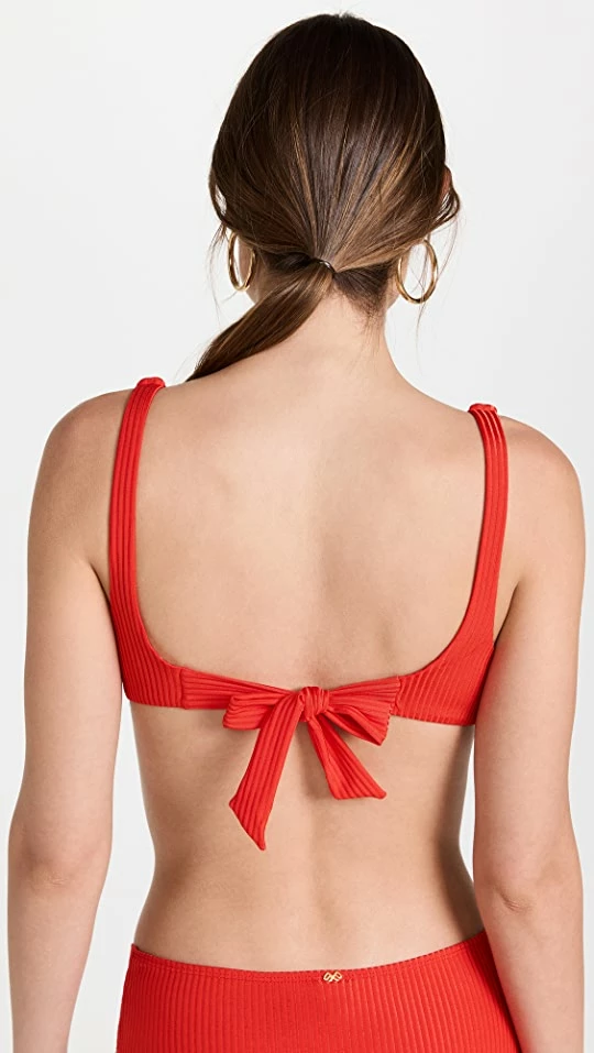 Ravishing in ruby red fabric, this PQ Swim bikini top features subtly textured fabric and a small knot between the cups.