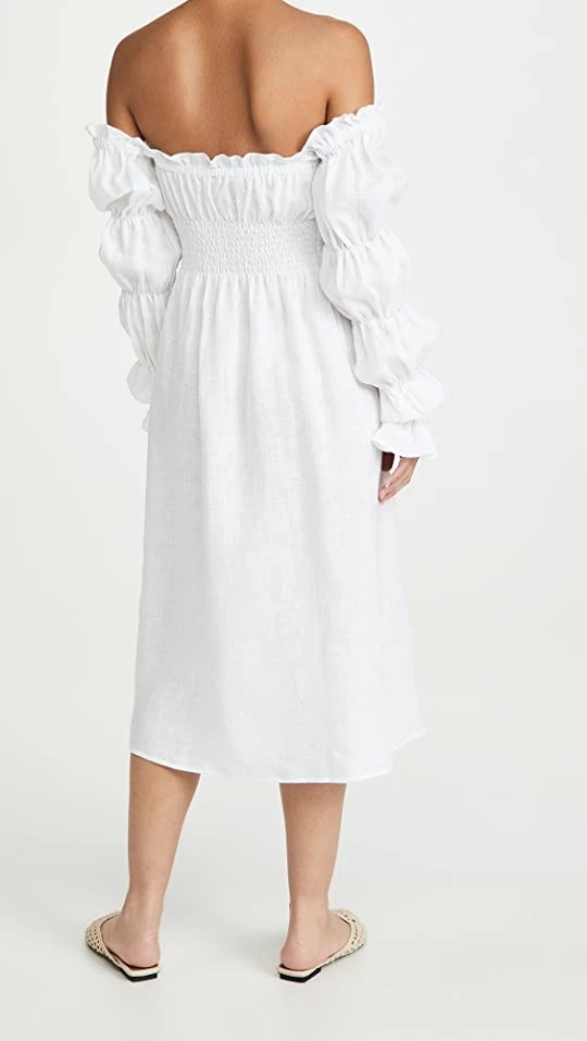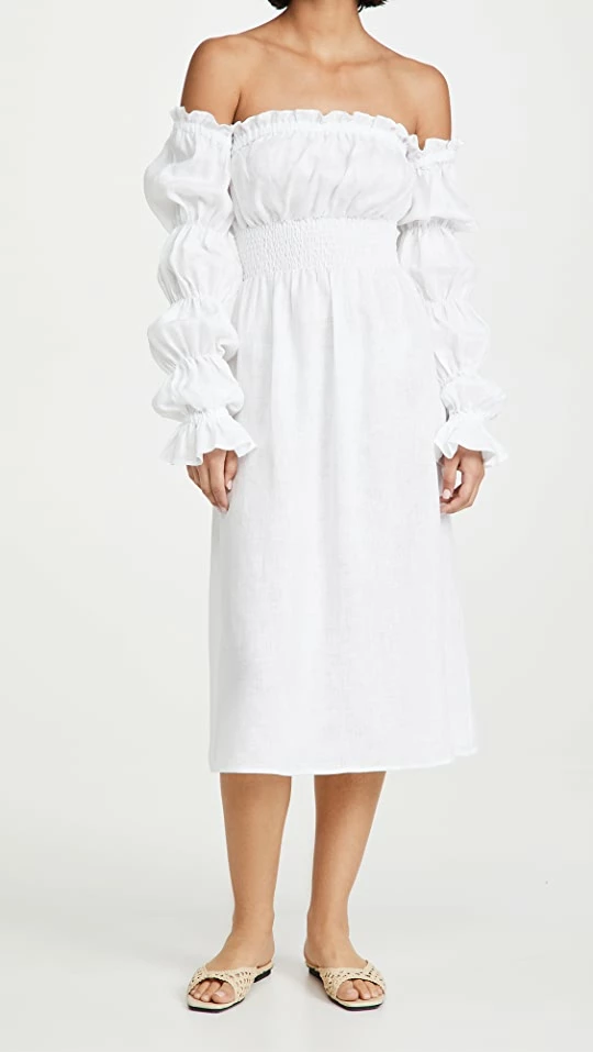 Crafted from breezy linen and enhanced with a lovely off-shoulder silhouette and accented with smocking at the waist and voluminous gathered sleeves, this Sleeper dress is a charming piece for sunny days. Play up the neckline with a few layered necklaces and finish your look with simple flats and an anklet.
