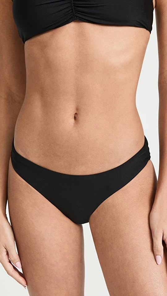 A sleek pair of solido bikini bottoms in dark fabric, accented with a subtle touch of ruching at the sides.