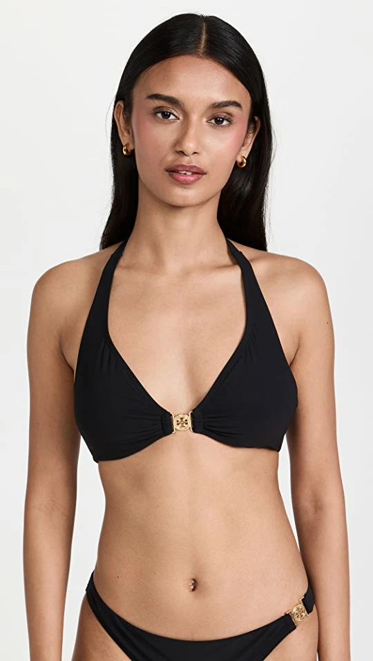 This Tory Burch bikini top features a classic halter silhouette finished with a gold tone center logo for a signature touch. Pair it with the designer’s matching bottoms and an oversized sun hat for a timeless poolside look.