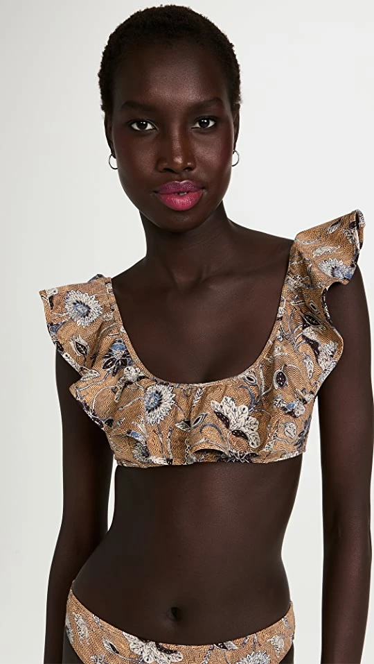 Structured ruffles and abstract patterning make this Ulla Johnson bikini top a stand-out choice, especially when it’s paired with the label’s matching bottoms.